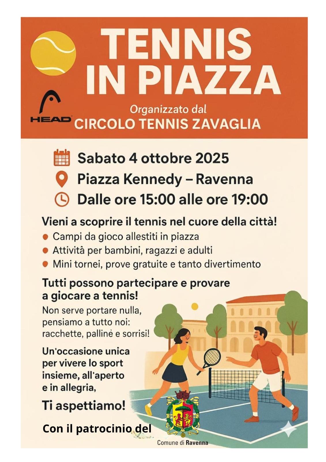 A Ravenna in piazza Kennedy il Circolo Tennis Zavaglia organizza Tennis in Piazza, campi da gioco, attività per bambini, ragazzi e adulti, mini tornei, prove gratuite e tanto divertimento, con il patrocinio del Comune di Ravenna