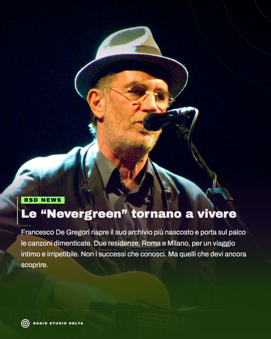 Il cuore del progetto resta immutato: dare nuova vita a quelle “nevergreen” che, pur lontane dai grandi successi, rappresentano tasselli fondamentali del suo percorso artistico. Un’operazione che è anche diventata racconto cinematografico nel film Francesco De Gregori. Nevergreen, diretto da Stefano Pistolini.